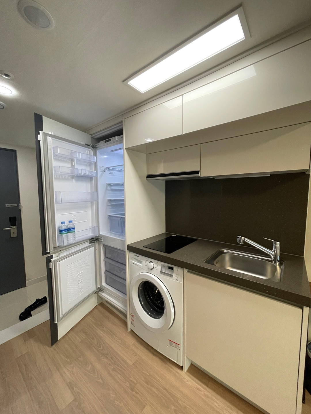 티비, 씽크대, 세탁기, 냉장고, 전기포트 등등이 있습니다. 쿡탑이 있는데 냄비나 조리기구들은 없었어요.