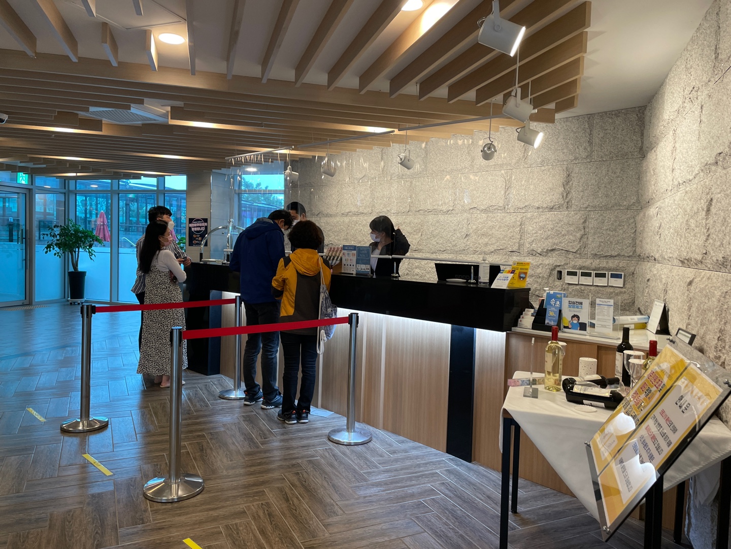 프론트에서 간단한 예약확인 및 입실하는 손님 모두 체온체크 모두 하고 방배정을 받아 입실했어요.