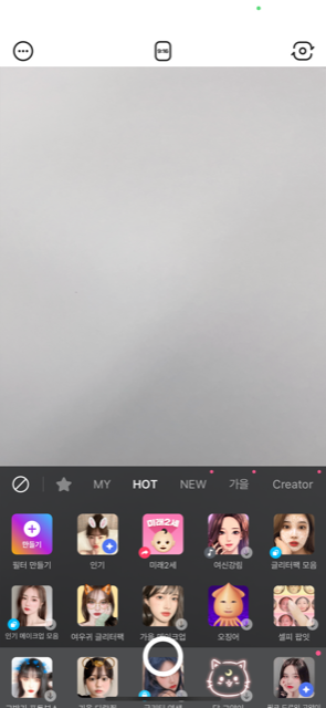 촬영 화면에서 이펙트 터치하시면, 아래처럼 핫(HOT)한 필터들만