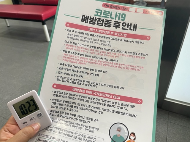 접종 안내문과 타이머를 받아서 한쪽에서 읽어보며 기다리고 있었어요.