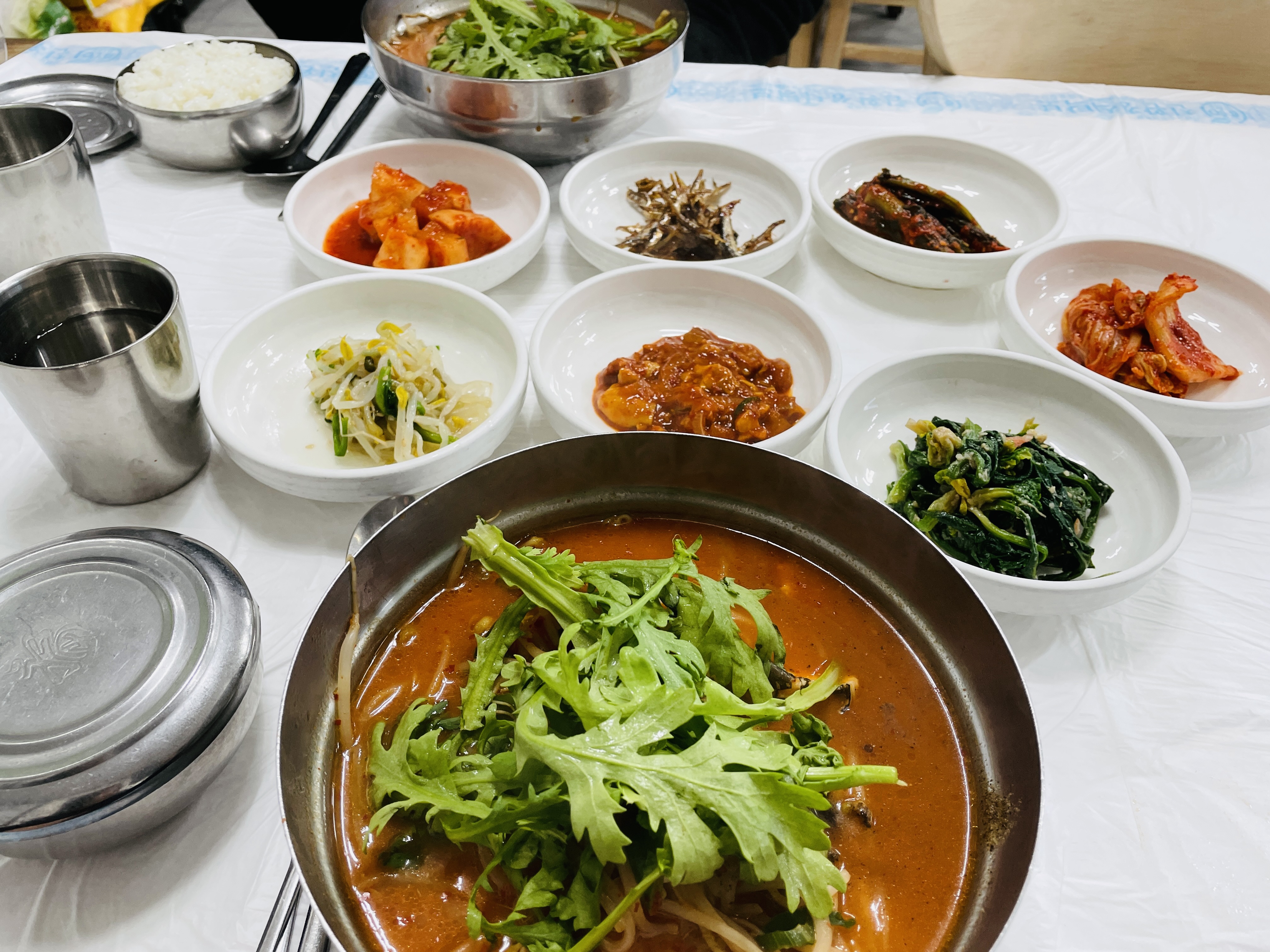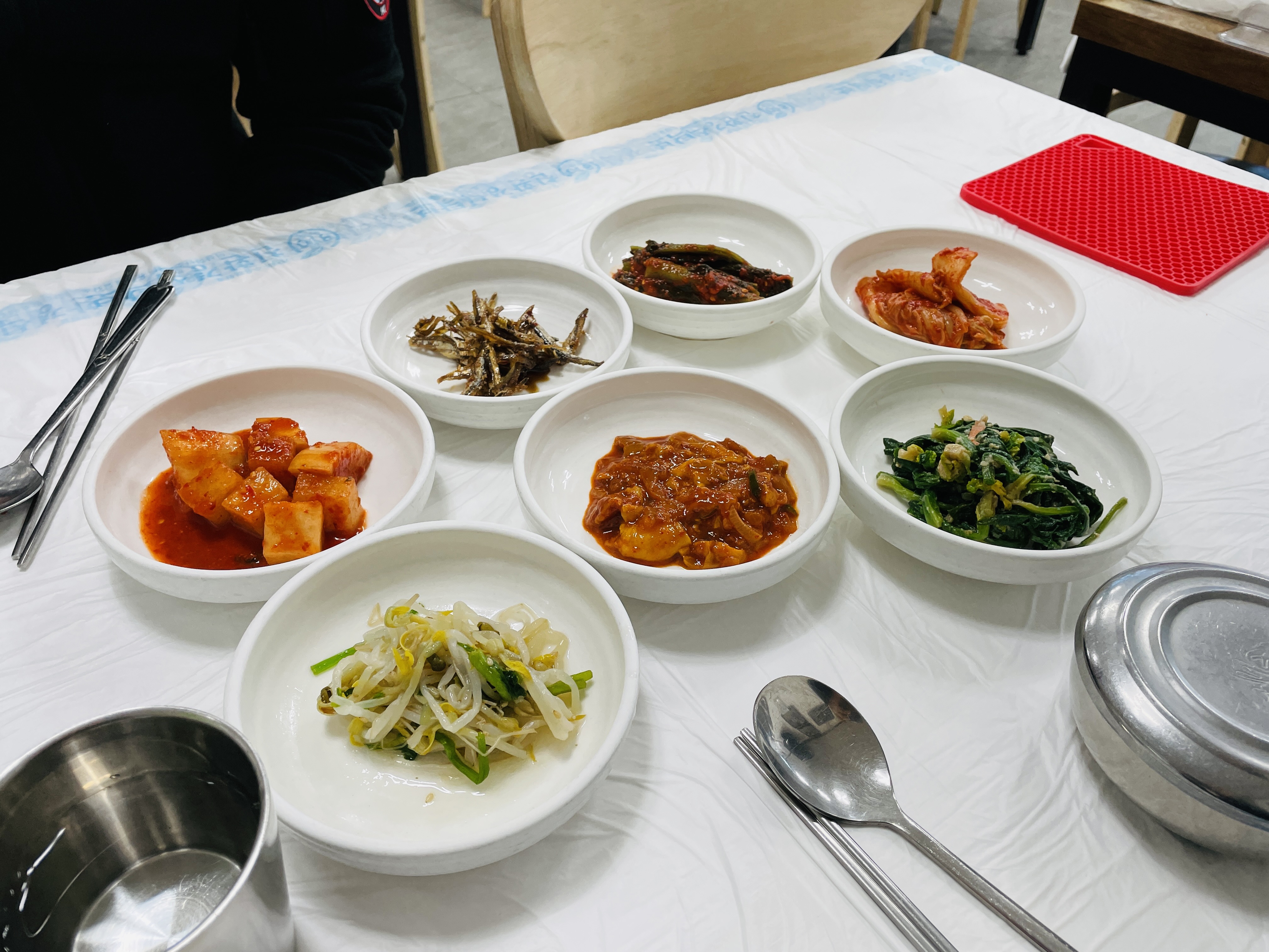 깍두기, 멸치, 갓김치, 김치, 멍게젓, 숙주나물무침, 시금치등등 맛있었습니다!!!