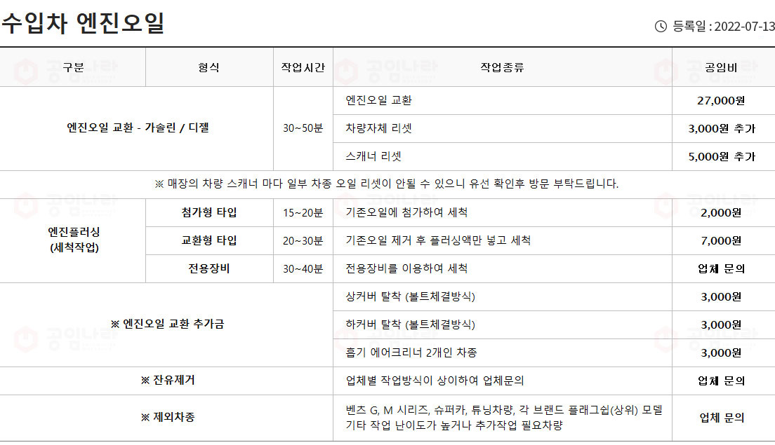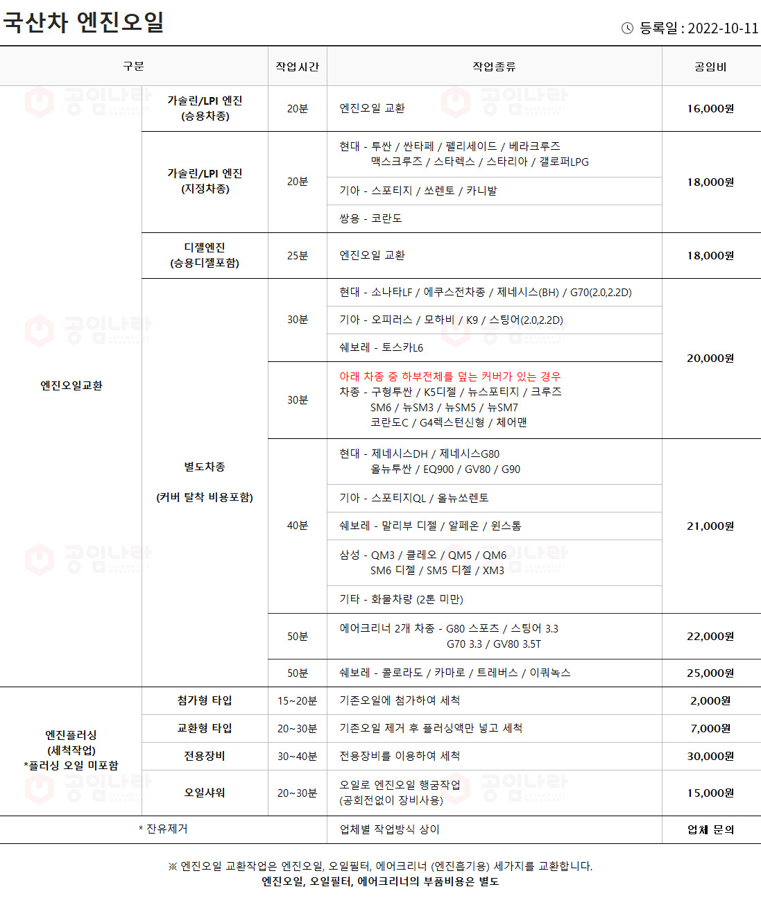 국산차 엔진오일교환 공임비는 16,000원 ~ 25,000원