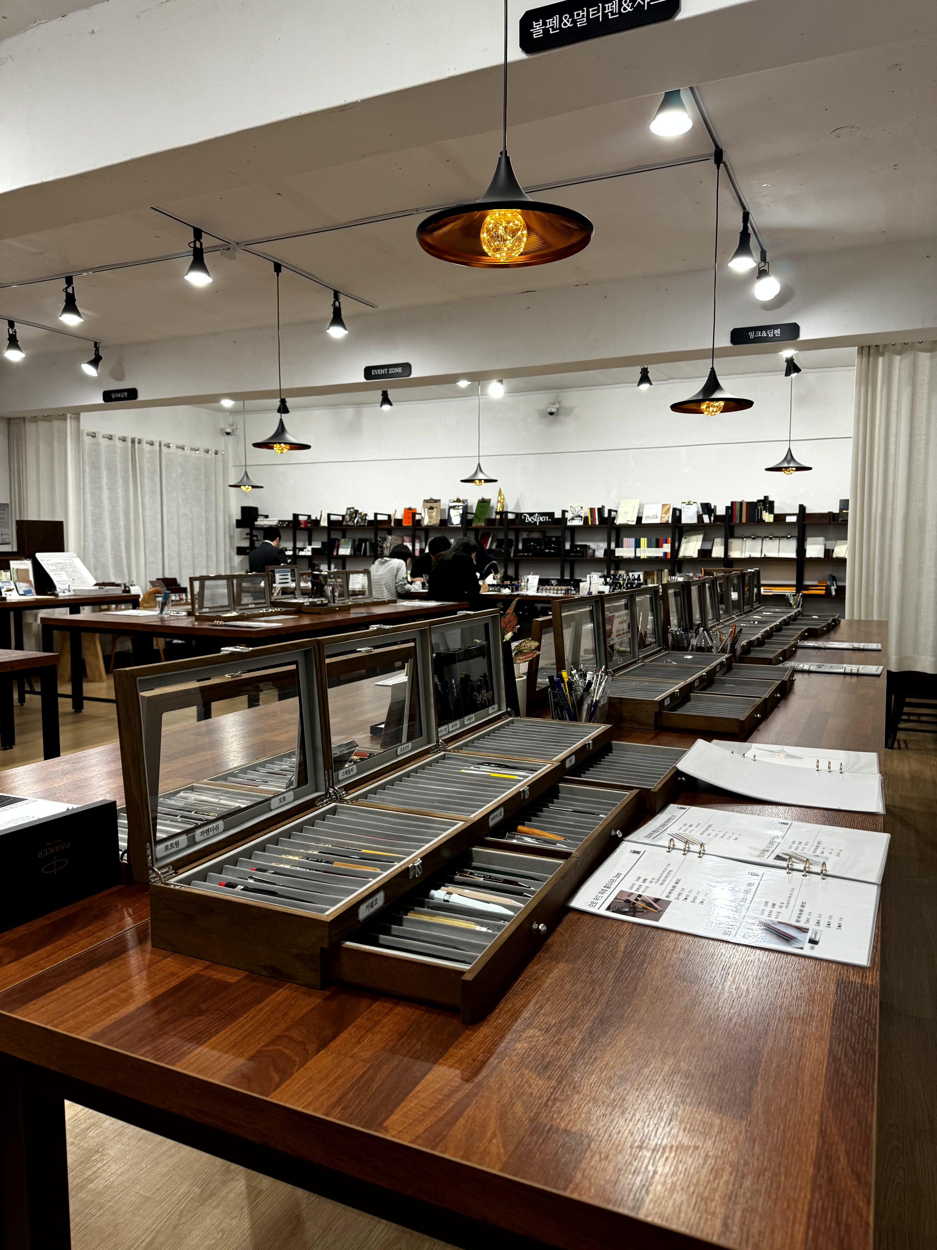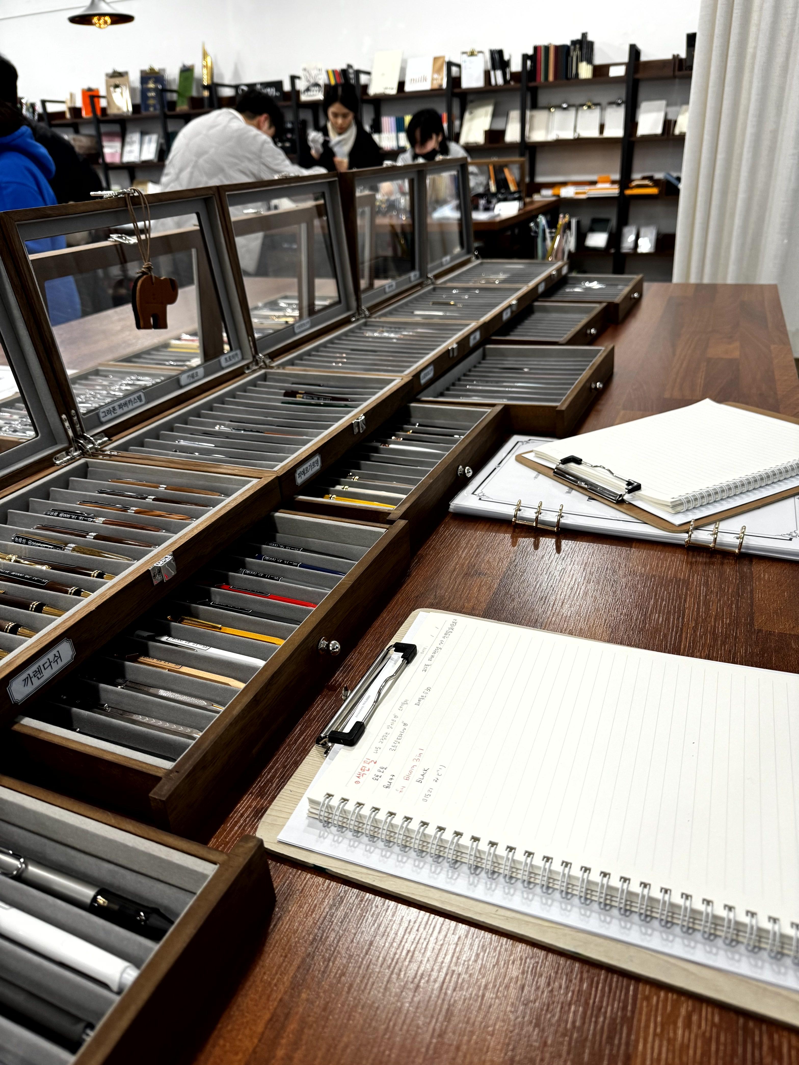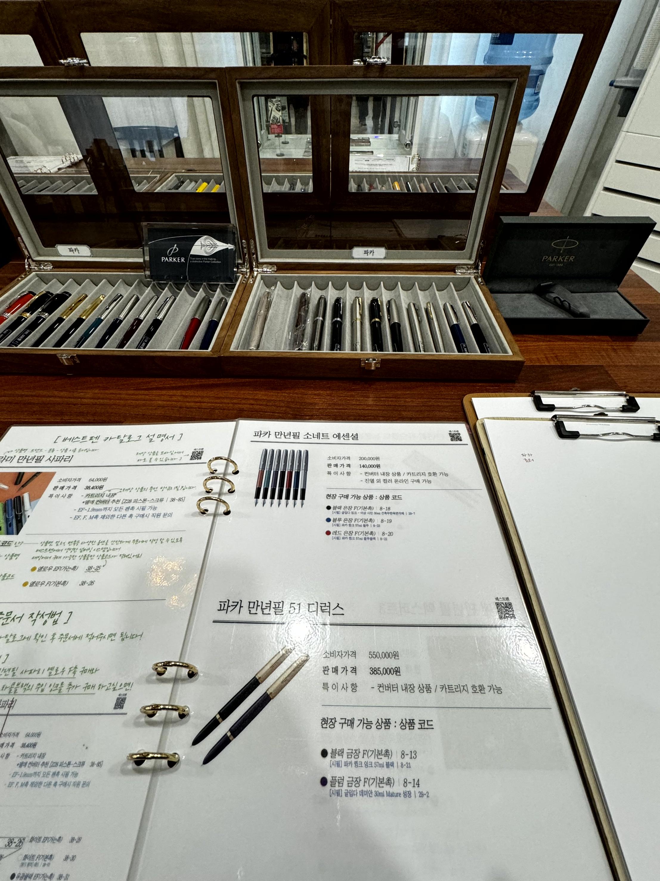 시필해볼 수 없어요. 그러나 가까이서 만져볼수는 있으니 만년필 입문자들 또는