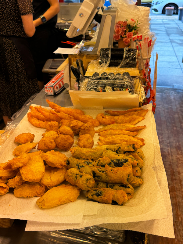 튀김 종류가 많더라고요! 새우튀김, 야끼만두, 못난이, 김말이, 고구마튀김 등등