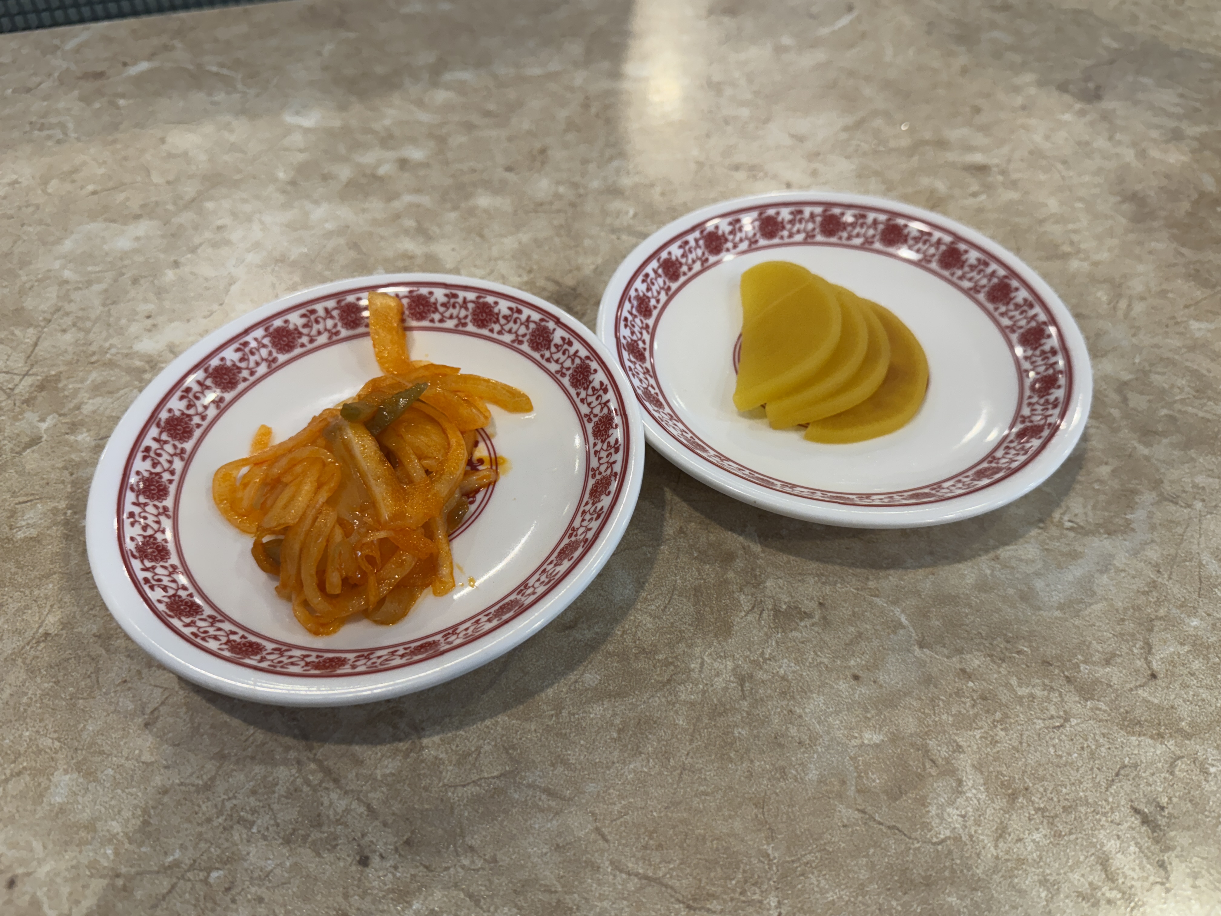 기본 반찬은 짜사이와 단무지가 정갈하게 나옵니다.