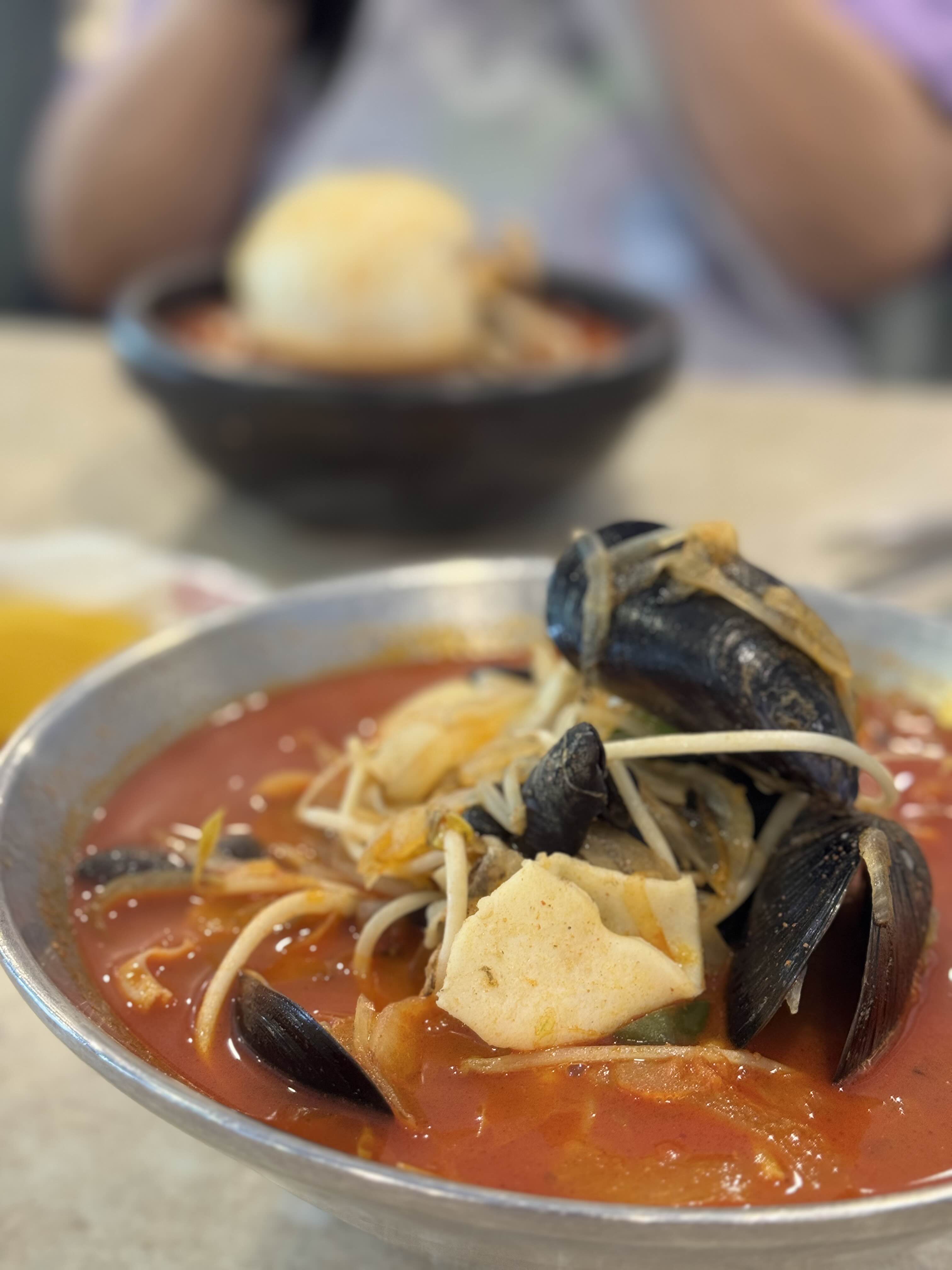 홍합, 바지락, 오징어와 함께 숙주, 양파 등이 어우러져 국물이 정말 시원합니다.