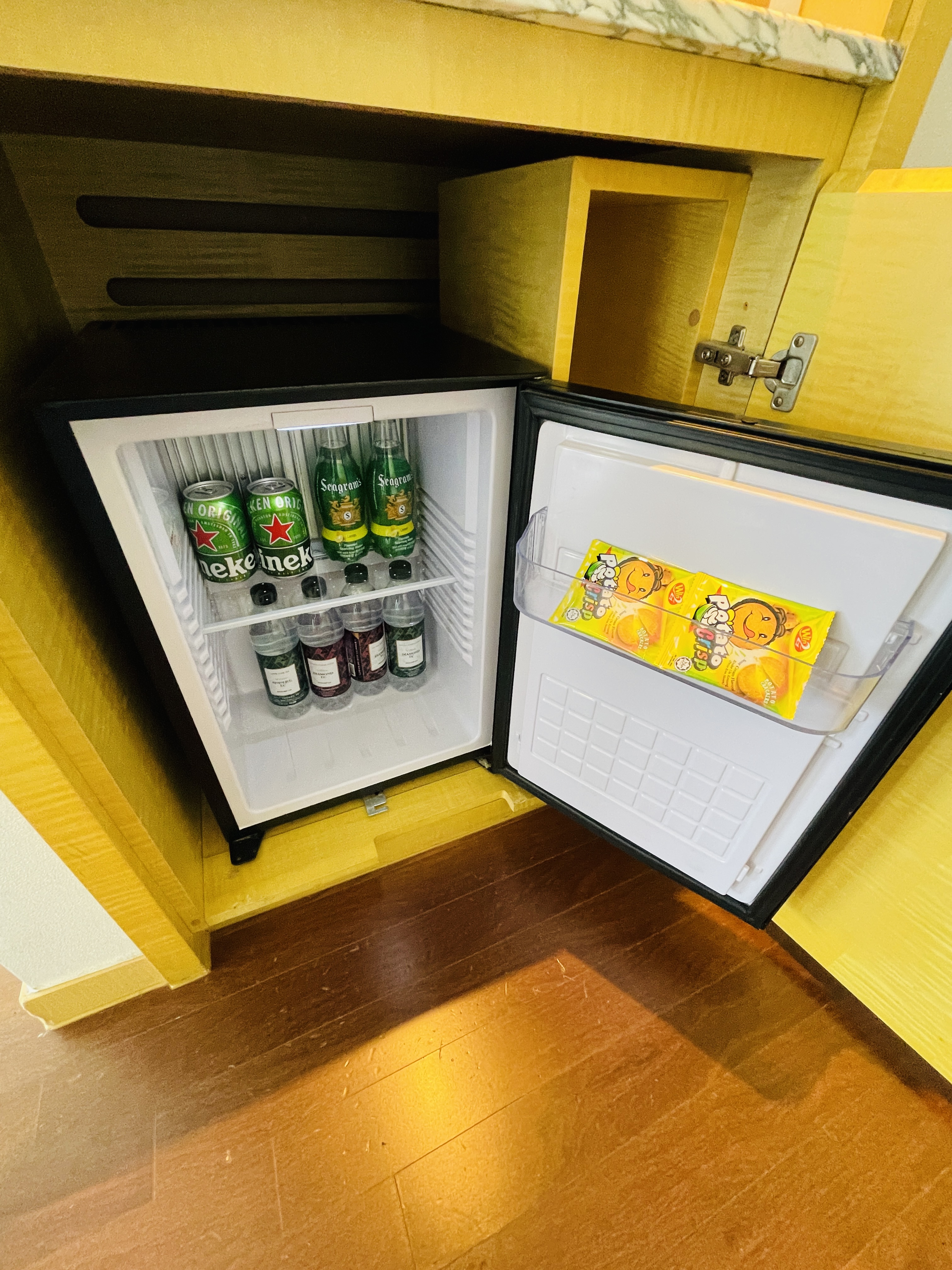 스낵바 아래 작은 냉장고안에, 생수, 맥주, 탄산수 등이 있어요!!