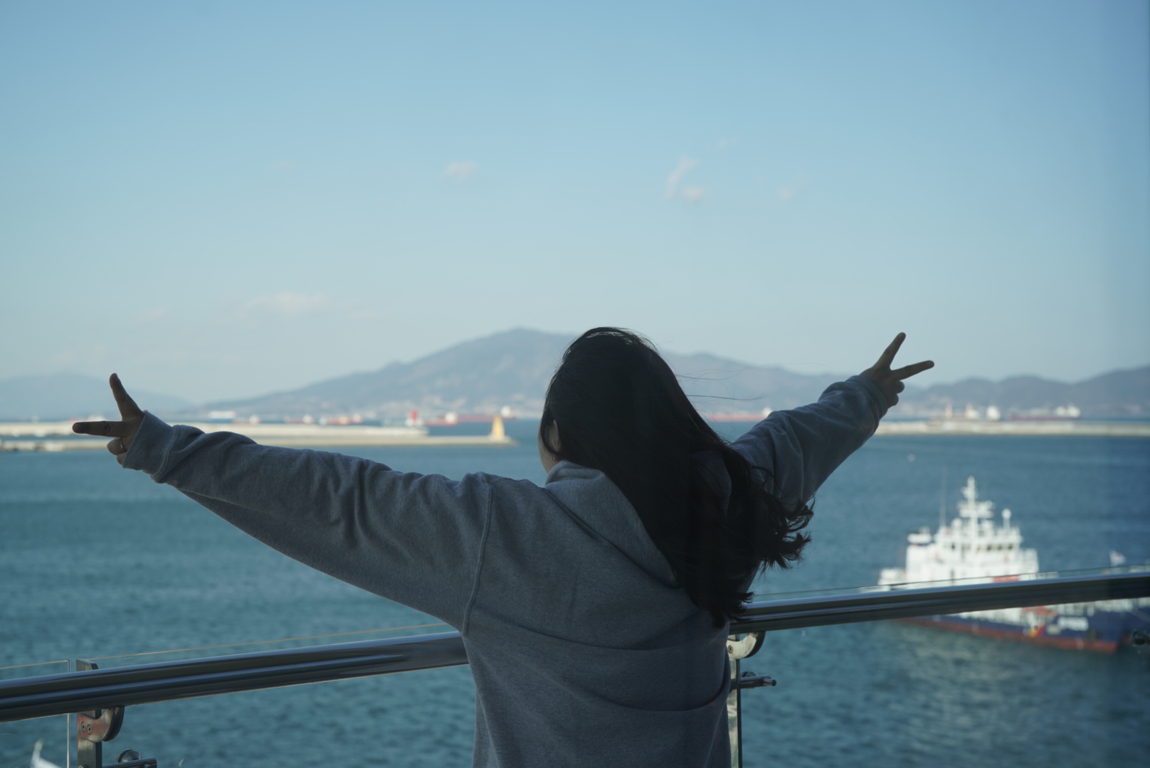 저 멀리 배가 지나가는 것도 보이고, 항구며 바다색이며