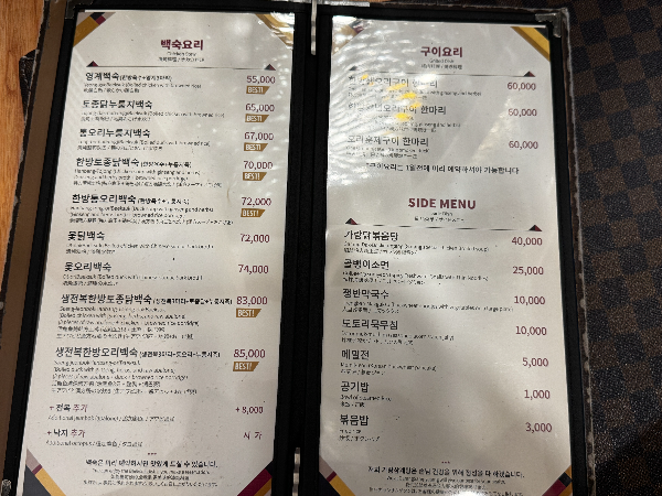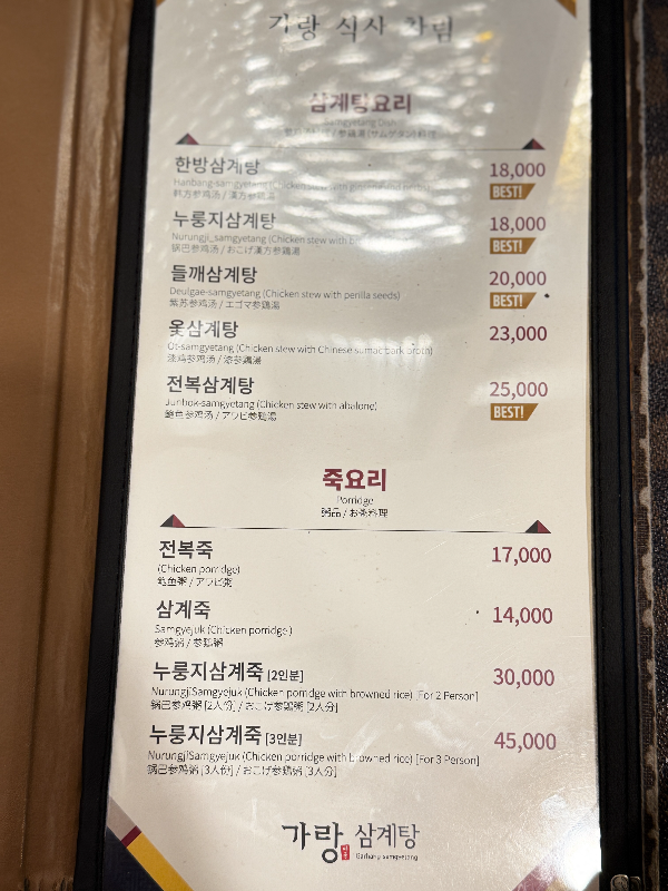메뉴 : 누룽지 삼계탕, 한방 삼계탕, 들깨 삼계탕, 토종닭 누룽지 백숙