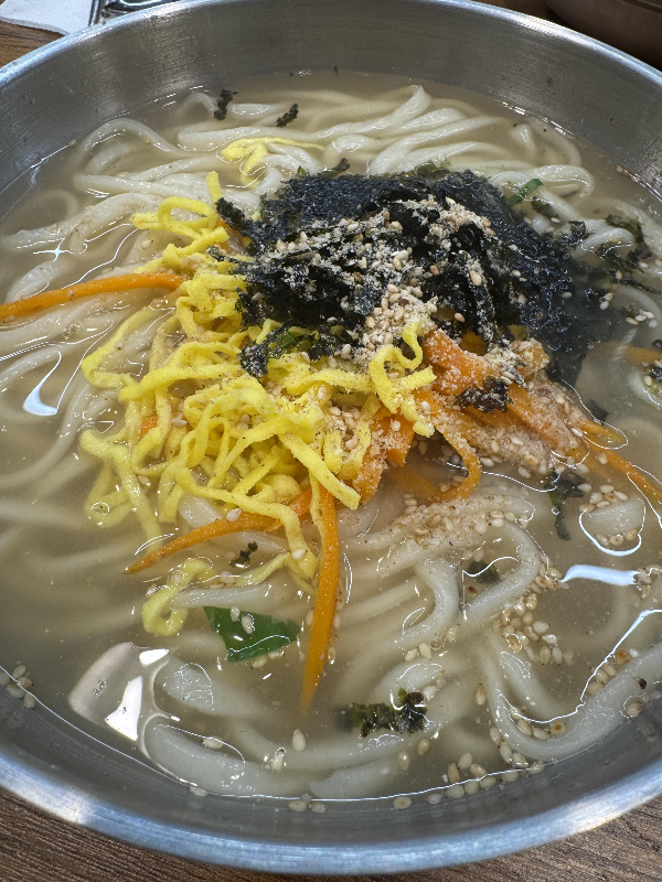 계란 지단, 당근 고명까지 알차게 올라가 있고, 국물은 멸치 베이스의 담백한 맛!